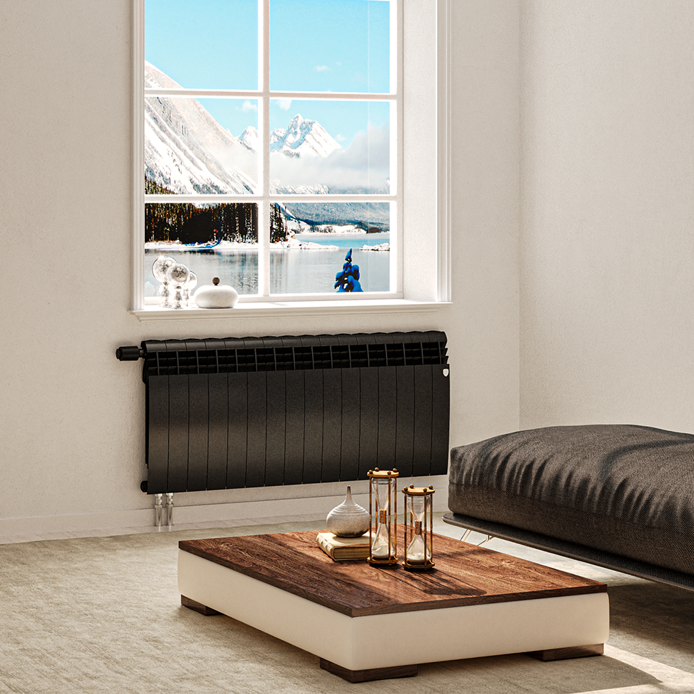 Биметаллический дизайн-радиатор для любых систем отопления с боковым подключением. Межосевое расстояние 350 мм позволяет установить радиатор под низкими подоконниками высотой от 60 до 90 см.