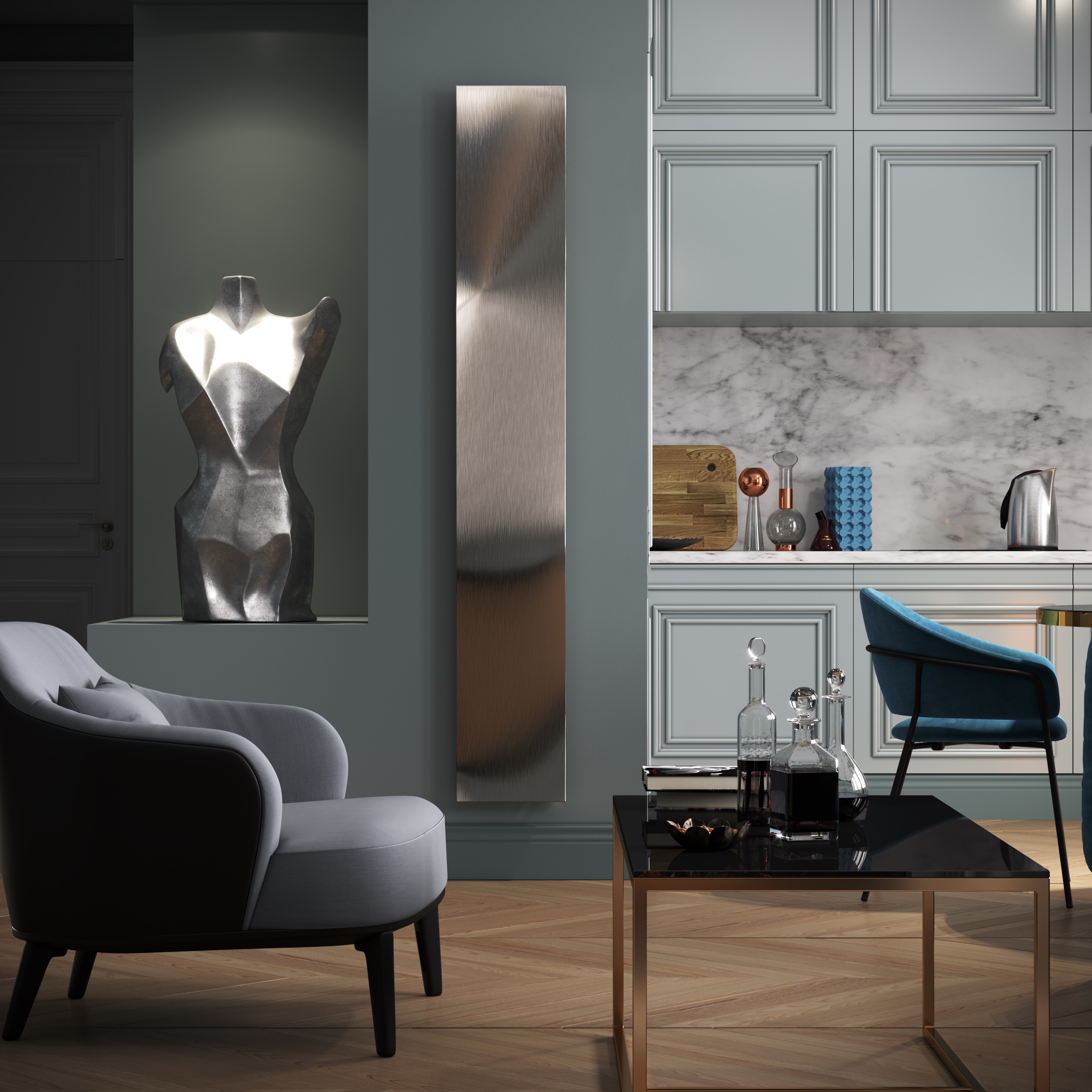 Панель-зеркало бронзированное. Такая панель не только зрительно увеличивает пространство комнаты, но и привносит в него особое тепло и мягкое золотистое свечение.