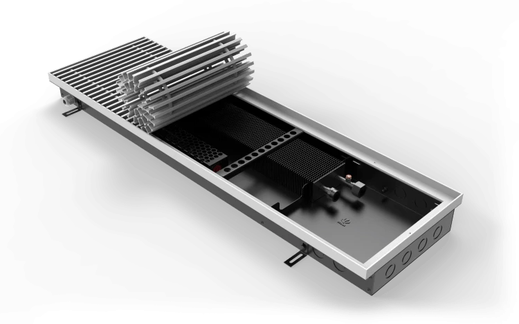 Встраиваемый в пол конвектор с естественной конвекцией VITRON - отопительный прибор, в котором установлен медно-алюминиевый теплообменник, тепло от которого передаётся в отапливаемое помещение путём естественной конвекции. Позволяет преградить поток холодного воздуха от застеклённых фасадов или окон. Данный тип конвектора служит для отопления только сухих помещений. Применяется в качестве основного отопительного прибора в помещениях с небольшими потребностями в отоплении или вспомогательного отопительного прибора с системами тёплого пола, вентиляции, радиаторного водяного отопления. Может быть установлен как в однотрубную, так и в двухтрубную систему отопления.
